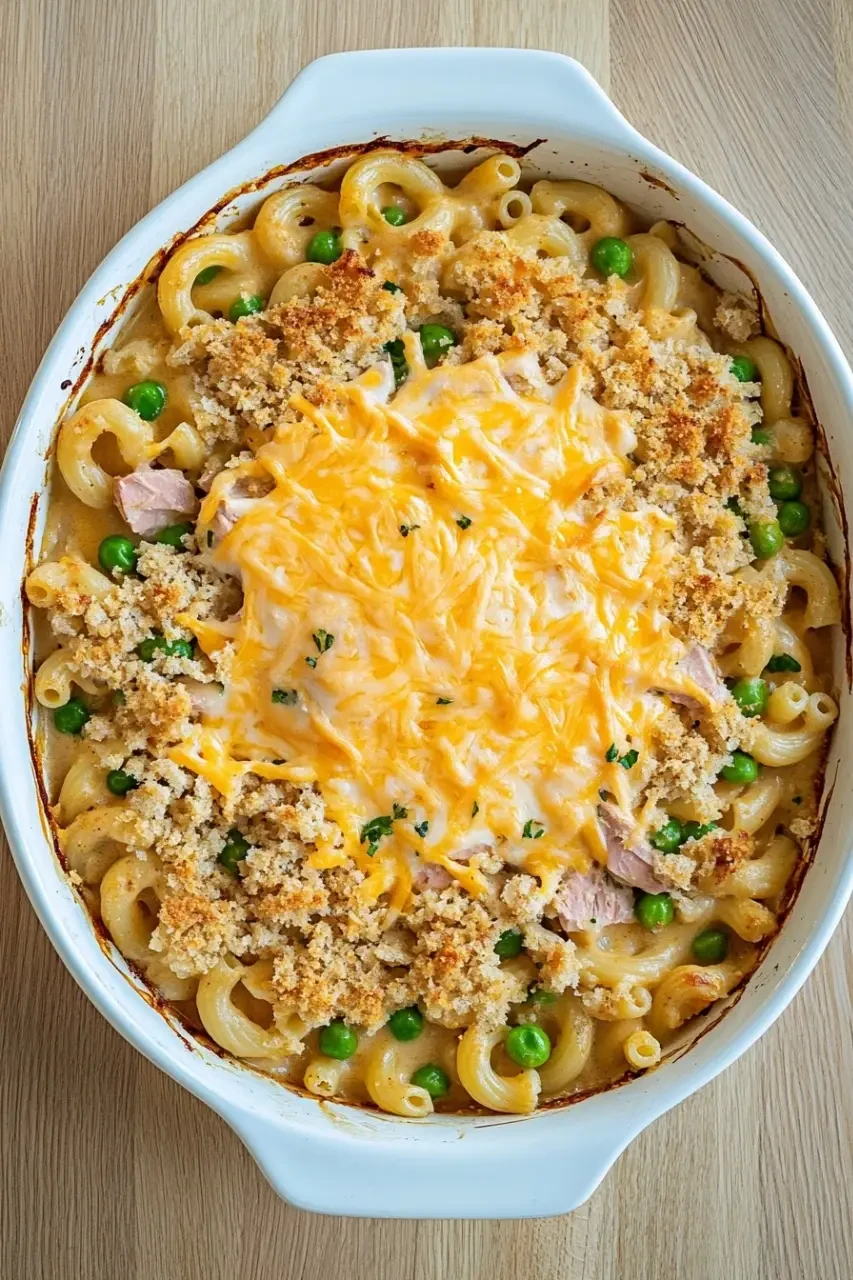 A comforting and easy-to-make tuna casserole featuring tender elbow macaroni, creamy sauce, and a crispy breadcrumb topping. Perfect for a family dinner or meal prep.