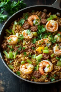 A flavorful one-pan meal featuring succulent shrimp cooked with spicy and savory Cajun-style dirty rice, loaded with bell peppers, onions, and Cajun seasonings for a hearty and satisfying dish.